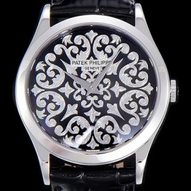 SA급 파텍필립남성용 칼라트라바 인그레이빙 38미리 오토매틱 블랙다이얼 PAT45725 xx > 파텍필립 레플리카