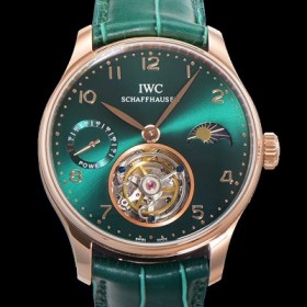 SA급 아이더블유씨 남성용 신제품 UP!! 포르투기즈 컴플리케이션 하이 "투어빌론 문페이즈 파워 리저브"아시안 투어빌론 탑재 18K 로즈골드 42mm 가죽줄 그린 다이얼 iwc1599 xx > I.W.C 레플리카