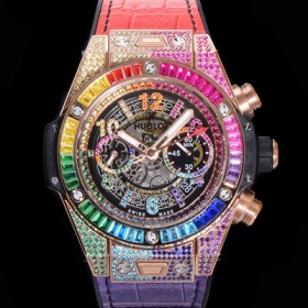 SA급 휴블렛 남성용 빅뱅 유니코 45mm 오토매틱 HUB1280 타입 18K 로즈골드/다이아몬드 풀케이스 러버줄 스켈래톤 다이얼 hub2151 xx > 위블로 레플리카