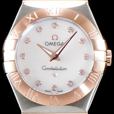 SA급 오메가 여성 컬렉션 컨스틀레이션 123.20.27.60.55.001 오메가 코-액시얼 27MM 로마 숫자가 인그레이빙된 베젤 18K 로즈골드 콤비 화이트 자개 다이얼 쿼츠 무브먼트 OMG0123 xx > 오메가 레플리카
