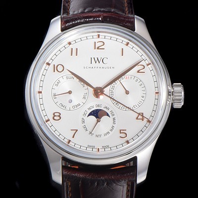 아이더블유씨 포르투기즈 퍼페추얼 캘린더 문페이즈 오토매틱 42mm Cal.82650 타입 남성용 가죽줄 화이트다이얼  iwc045194837
