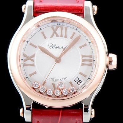 여성미가 넘치는 해피 스포츠 36mm 오토매틱 워치는 로즈 골드와 스테인레스 스틸 소재로 제작되었으며, 고도의 노하우와 세련된 가죽 스트랩이 돋보이는 완벽한 쇼파드 스타일의 워치입니다. 쇼파드의 시그니처인 무빙 다이아몬드는 생동감 넘치는 빛의 향연 속에서 발랄하게 춤을 추고 있으며, 현대적인 실버톤 다이얼은 로즈 골드 톤 로마 숫자 및 핸즈와 우아한 조화를 이룹니다.