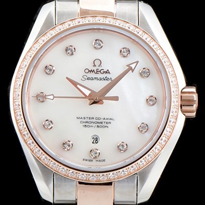 SA급 오메가 여성용 씨마스터 "우아함의 정수" 220.25.38.20.55.001 아쿠아 테라 코-액시얼 크로노미터 화이트 자개 다이얼 18K 로즈골드 투톤콤비 오토매틱 무브먼트 OMG0103 xx 요약정보 및 구매