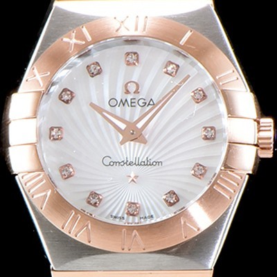 SA급 오메가 남성용 여성 컬렉션 컨스틀레이션 123.20.27.20.55.002 오메가 코-액시얼 27MM 로마 숫자가 인그레이빙된 베젤 18K 로즈골드 콤비 화이트 자개 다이얼 쿼츠 무브먼트 OMG4120 xx > 오메가 레플리카