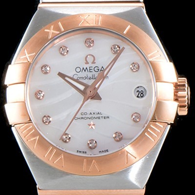 SA급 오메가 남성용 여성 컬렉션 컨스틀레이션 123.20.27.20.55.003 오메가 코-액시얼 27MM 로마 숫자가 인그레이빙된 베젤 18K 로즈골드 콤비 화이트 자개 다이얼 쿼츠 무브먼트 OMG4110 xx > 오메가 레플리카