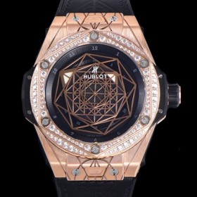SA급 휴블렛 남성용 빅뱅 쌍 블루 오토매틱 HUB1213타입 45미리 18K 로즈골드 다이아몬드/보석 베젤 가죽/우레탄 믹스밴드 블랙다이얼 hub63518 xx > 위블로 레플리카
