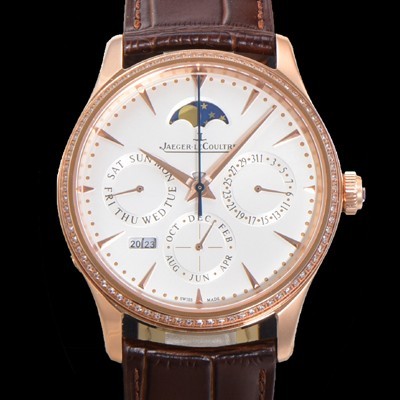 SA급 예거르꿀뜨르 남성용 마스터 울트라 퍼페추얼 캘린더 18K 로즈골드 오토매틱 MC868 타입 39mm 가죽줄 다이아몬드베젤 문페이즈 화이트 다이얼 jag80287 xx > 예거르꿀뜨르 레플리카