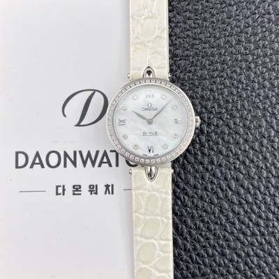 • SA급 오메가 여성용 드빌 424.18.27.60.52.001 프레스티지 듀드롭 27.4mm 다이아몬드 쿼츠 무브먼트 화이트 자개 다이얼 omg0238 xx