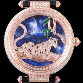 SA급 까르띠에 남성용 팬더 오 끌레르 드 륀 드 까르띠에 HPI00712 18K 로즈골드 하이 쥬얼 세팅 픽첼 다이얼 스위스 쿼츠 무브먼 CAR0012 xx > 까르띠에 레플리카
